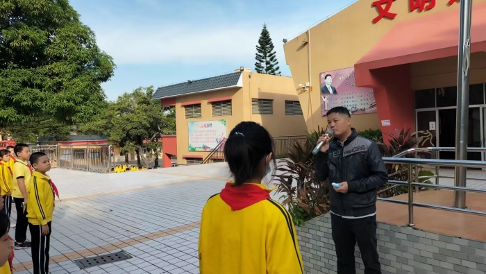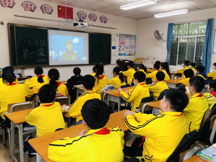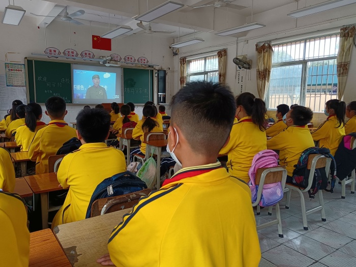 升旗仪式后,在学校德育处的统一安排下,全校师生观看“广东开学第一课”。退役军人吴冬生,宣讲军旅故事,他把火热的青春献给军营,退役后发起并成立珠海市国防教育促进会,讲授国防教育课500多场,将红色基因种在青少年的心中,老前辈的奉献精神和高尚品格,令同学们肃然起敬。