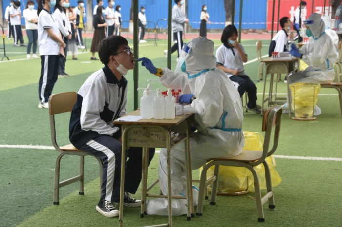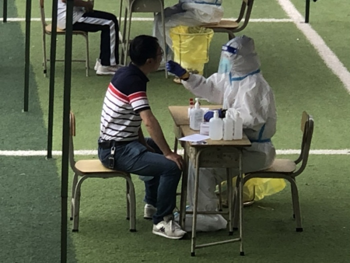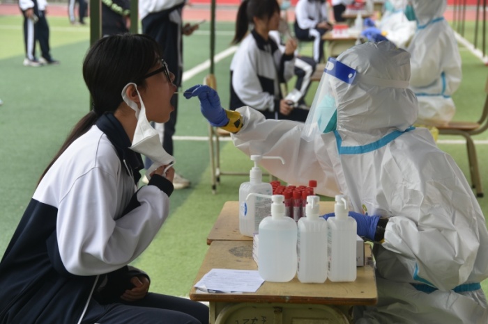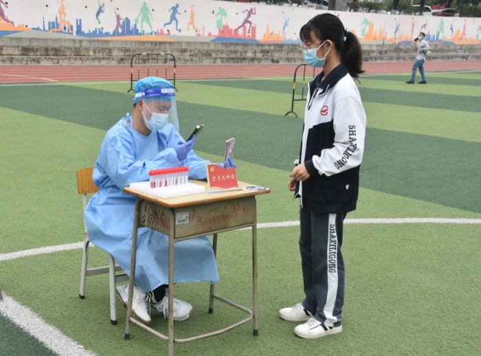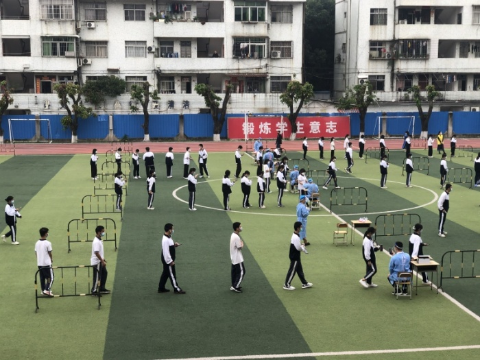 当天上午8:30,在学校运动场按照相关要求划分出来的6个检测通道准备就绪,被安排在第一批开展核酸检测的现代服务业部师生安静地排队等候,随后各专业部各班级学生在专业部组织下也有序开展核酸检测。在现场,全体人员佩戴口罩,间隔一米,分时间段、分批进入检测点,每10人为一组,依次进行扫码登记、采样,严格按照“分批入场,即采即撤”的方式进行。
