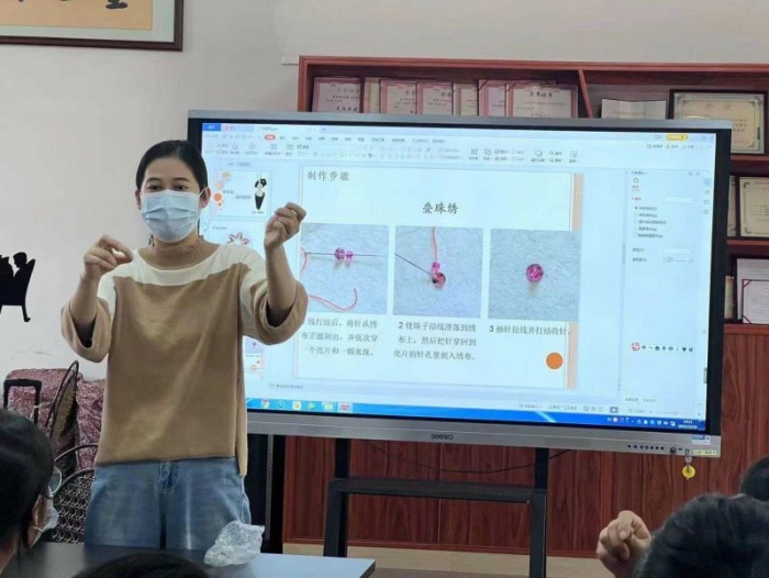 为增强实用性,该支部还面向当地妇女群众开展实用性、针对性强的职业技能培训。服装专业教师高尧曦手把手教大家掌握非遗粤绣中珠绣工艺技能,增强学员们从事服装产业岗位的竞争力。课堂上,学员们通过“做中学,学中做”的方式,跟从老师一步步完成珠绣胸针的制作过程。课程结束后,学员们普遍表示,掌握一技之长非常有用,增强就业创业的信心,为自己就业创业搭建不断学习的平台。