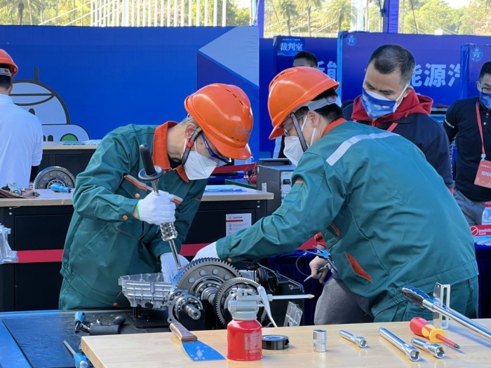 新能源汽车维修项目基于新能源汽车电动化,对接新能源汽车企业先进技术、国家标准和行业标准,以培养新能源汽车电动化相关领域高技能人才为目标,考查选手对新能源汽车电动化技术和实际操作技能的掌握能力。比赛分为两个模块,分别是新能源汽车动力总成拆装与检测和新能源汽车故障诊断与排除。