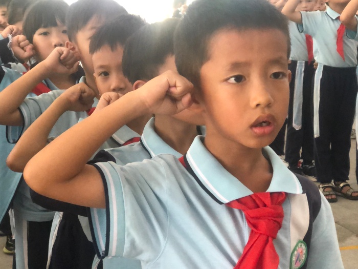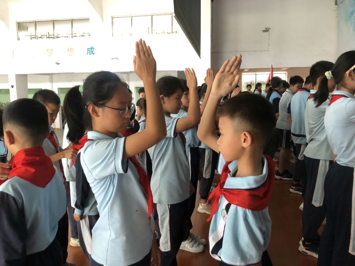 当辅导员和老队员为二年级的新队员带上鲜艳的红领巾的那一刻,当新队员举起右拳许下誓言的那一刻,当他们向敬爱的辅导员献上队礼的那一刻,一个个骄傲而自豪的笑容洋溢在每一个孩子的脸上,一个个坚定而幸福的眼神透露出他们内心的渴望。多么光荣而又兴奋的时刻啊!少先队员代表声情并茂地发言,表达出作为一名少先队员,当以严格的标准规范自己的行为,努力学习,团结协作,牢记自己的使命是一件多么光荣的事情。最后在大队辅导员的带领下,少先队员们大声呼号:“时刻准备着”,孩子们的决心响彻了整个校园。