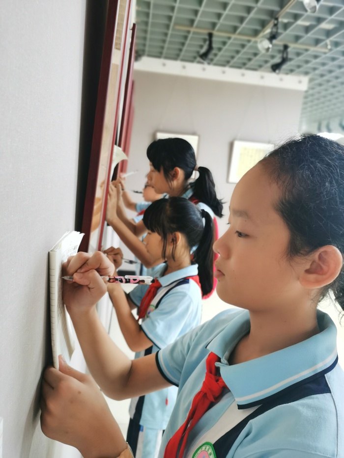 同学们参观完展览后,个个深有感触。其中五(3)班雷焮熠同学说:“这些诗人的诗画无一不表达对祖国的热爱,令人印象最深刻的是一首《中国共产党百年风采颂》。这首《中国共产党百年风采颂》是阮建能老师创作并由李易老师书写的。李易老师的书法铿锵有力,展现了党引领中国人民从站起来、富起来到强起来的伟大飞跃的精神气概。诗句‘伟绩丰功闪闪光’让我回想起电视中了解到祖国这些年来伟大事业的成就,实现第一个百年奋斗目标伟大事业而感到骄傲。读完这首古诗,在我心中默默播下了一颗爱国的种子,身为一名少先队员,我应该做的就是好好学习,天天向上。”