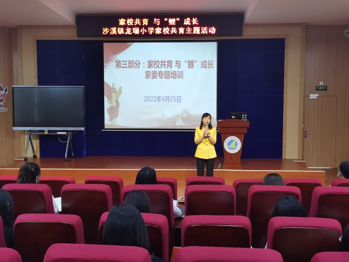 家庭教育是教育的起点和基点,也是教育的主战场。家长拥有科学的教育方法,对孩子的成长至关重要。为广泛传播家庭教育科学知识,指导广大家长科学教子,增进家校联系,达到家校携手共育的目的,龙瑞小学结合家校共育实践基地学校的中心工作,于4月25日下午在学校多功能厅举行了主题为“家校共育 助鲤成长”的家校共育志愿服务队成立仪式暨家委专题培训。