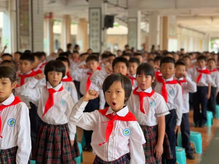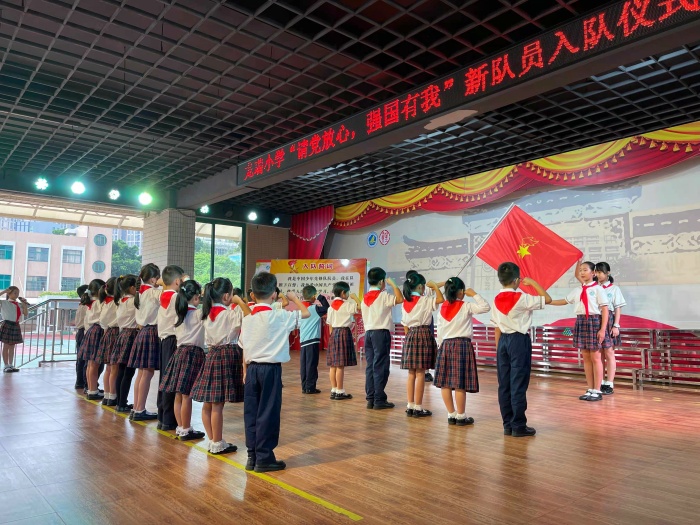 当大队辅导员黄笙宥老师宣读新队员名单后,六年级的哥哥姐姐作为代表为二年级新入队的弟弟妹妹有序佩戴上了鲜艳的红领巾,并互敬队礼,见证了新队员们成长中的重要时刻。飘扬在胸前的红领巾,不仅是“少先队员”身份的光荣象征,更是引领着新队员不断前行的火炬。接着,在大队长郑佩怡的带领下,全体队员在队旗下,骄傲地挺起胸膛、握紧拳头庄严宣誓:“我是中国少年先锋队队员,我在队旗下宣誓:我热爱中国共产党,热爱祖国,热爱人民,好好学习,好好锻炼,准备着,为共产主义事业贡献力量!”铿锵有力的宣誓声,表达了队员们向上的决心与意志。