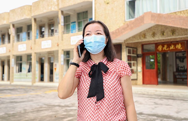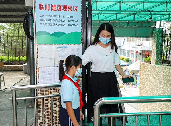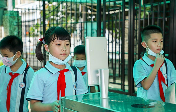 在入校情景演练中,学生按照学校规定的时间错峰回校,进校门按要求前后间隔一米,刷脸测温合格后有序进入教学楼。