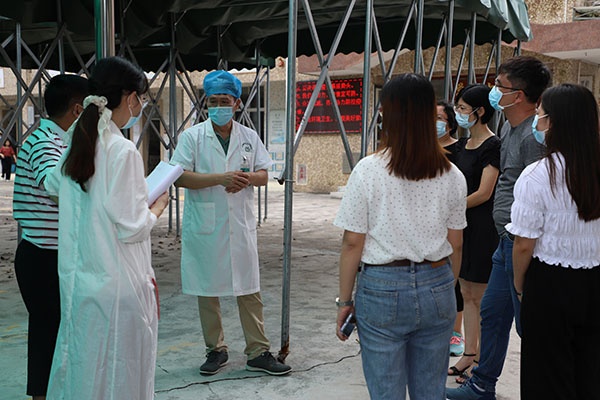 8月29日上午,检查小组如期而至,校长辜鸿雁率领防控工作领导小组成员于校门口迎接检查小组。