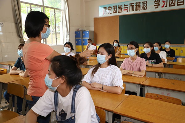 演练模拟了学生进校、班主任晨检、课堂突发异常等情景。进校时,学校实行错时错峰上学,入校时全体师生戴好口罩以一米间距站好,依次走过测温区,体温正常、无其他症状者按照规定路线进入班级;如发现体温异常学生,值班老师立即保持一米间距带到隔离室,询问情况,并上报。学生离开后,隔离室立即消毒。