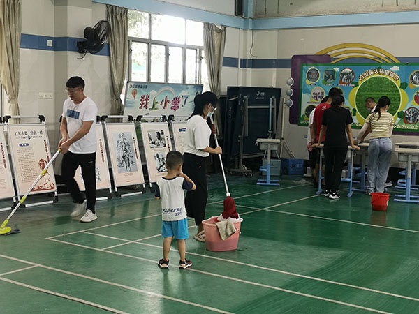 防控演练结束后,在学校亲子义工队的协助下,濠涌小学进行了全校的深度清洁、消杀工作。
