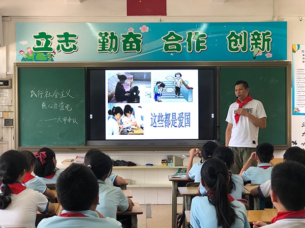 在庄严的出旗活动后,各队员们在辅导员的带领下,复习了社会主义核心价值观念的发展历程,了解到核心价值观念随着时代的变化而不断完善着。由新中国初期的“五爱”发展为八十年代的“五讲四美三热爱”,再到党的十八大明确提出“积极培育和践行社会主义核心价值观”,确定了“富强、民主、文明、和谐、自由、平等、公正、法治、爱国、敬业、诚信、友善”为核心价值观的具体内容。同学们在学习中了解到,“富强、民主、文明、和谐”,是我国社会主义现代化国家的建设目标,“自由、平等、公正、法治”,是对美好社会的生动表述。
