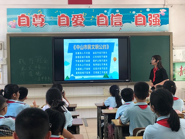 接下来,队员们围绕“如何创建文明校园、争做文明学生、践行核心价值观”开展了热烈的讨论。有的队员结合《中山市民文明公约》提出了自己的见解,有的联系实际生活,谈到在进校、升旗、课间、课堂该如何做。在讨论中,队员们的认识更加深刻了。