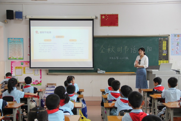 在主题班会上,老师向学生们简单地介绍了重阳节的起源、民间习俗活动、神话故事传说以及有关重阳节的诗词,不仅让学生了解到有关重阳节的知识,还让学生懂得了“孝亲敬老”的中华传统美德,要做到常怀敬老之心,继承敬老、爱老的传统美德。