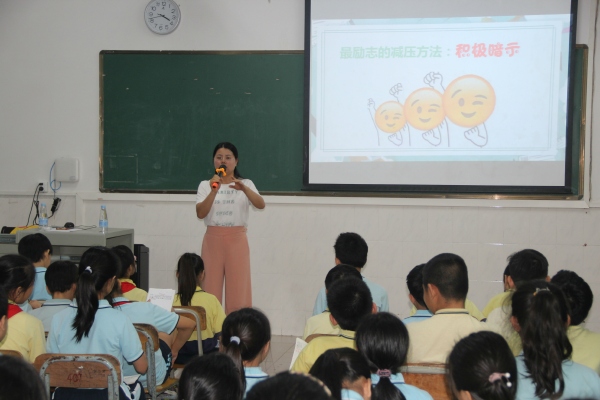 会上,罗老师先向同学提问:“你觉得压力是什么?”,有的同学说是“大山”,有的说是“敌人”,还有的说是“千斤顶”……随着话题的展开,罗老师在现场进行了一个关于学习压力的小调查,看看同学们感到自己的压力值大约是多少。然后,罗老师告诉孩子们,焦虑的根源来源于负面的情绪,要想管理压力,首先就要直面担忧,树立正面的目标,其次,合理的目标定位,提升完成的效果与自信心,做事之前要做好充分的准备。接着,罗老师还给同学们送来了几个减压的小妙招:大笑,笑声可以减轻心中的压力;大哭,释放内心的负面能量;运动,锻炼身心;倾诉,向自己相信的人说出心里话;积极暗示,多给自己积极的信念;饮食减压,通过适量适当的饮食来调节自己的情绪;保持良好的睡眠。最后,罗老师还提醒同学们,感到焦虑,有压力的时候,可以利用“蝴蝶拍技术”来减缓焦虑。