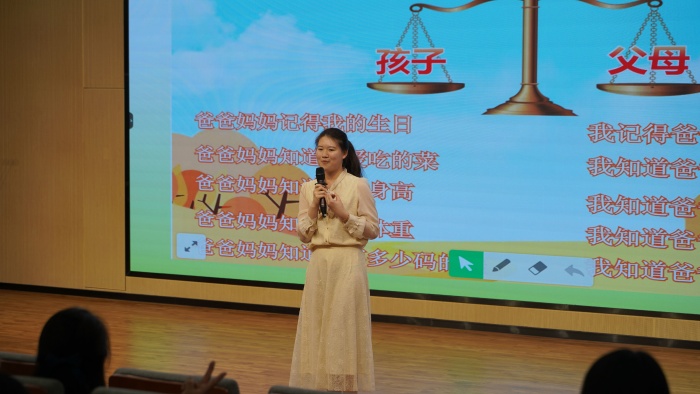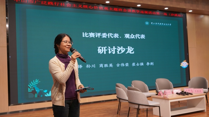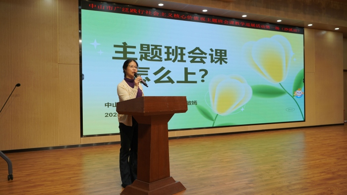 中山市教育教学研究院德育教研员朱敏嫣老师以《主题班会课怎么上》为题,就现时主题班会课的教学现状提出了相关建议,她围绕主题班会课目标中的“知、信、行”三个字,以沙溪镇康乐小学梁钰婷老师的一节班会课《孝敬父母,学会感恩》为例,强调如何优化主题班会的授课内容与方式,使学生更好地吸收社会主义核心价值观的营养。朱老师娓娓道来,使与会人员更清晰、更准确地掌握社会主义核心价值观主题班会课的教学意义、规范、策略。