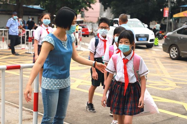 早上七点,校领导和值日老师们早已在校园的各个岗位严阵以待,等候同学们的到来,虽然下着蒙蒙的细雨,依然阻挡不了师生们复学的热情。同学们都戴着口罩自觉间隔1米以上,排队检测体温,通过人脸识别进入校园。家长们为了校门口交通顺畅,也自觉配合学校的各项规定,一切秩序井然。