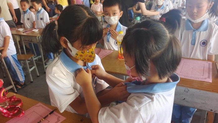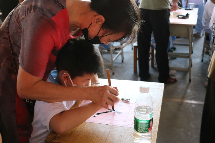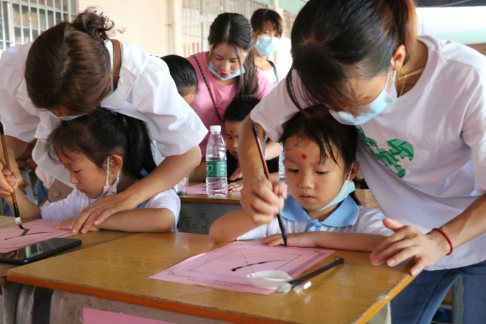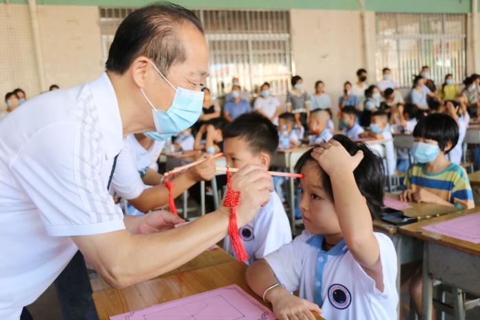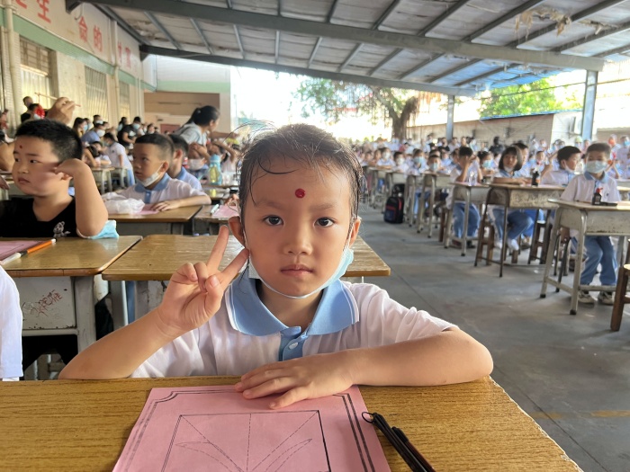 到了第三个环节则是“朱砂启智”。在古代,学童入学读书前,都会有启蒙师长用红色的朱砂在学子们的额头正中点上红痣,称为“开天眼”。当中的“痣”通“智”,意为开启智慧,以此寄托美好的愿望,从此眼明心亮,奋发学习。在这一活动里,孩子们也纷纷亮出自己的天眼,感谢老师的启蒙。