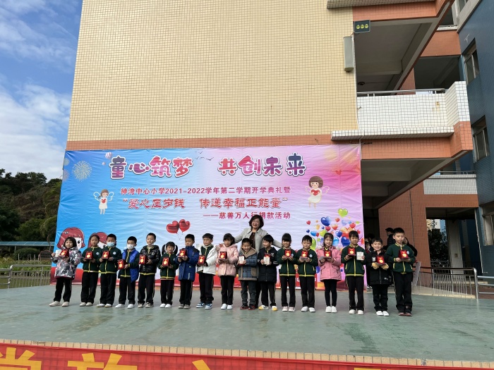 五星红旗缓缓升起,开学典礼正式开始。先是由“学习财神”为全体学生送上祝福,希望全体学生新学期学业旺、身体棒。接着对上学期的学习标兵进行表彰,希望全体学生向他们学习,在新学期里争先创优。随后是慈善万人行的捐款仪式,同学们都奉上了自己的爱心,为慈善事业尽了一份力。