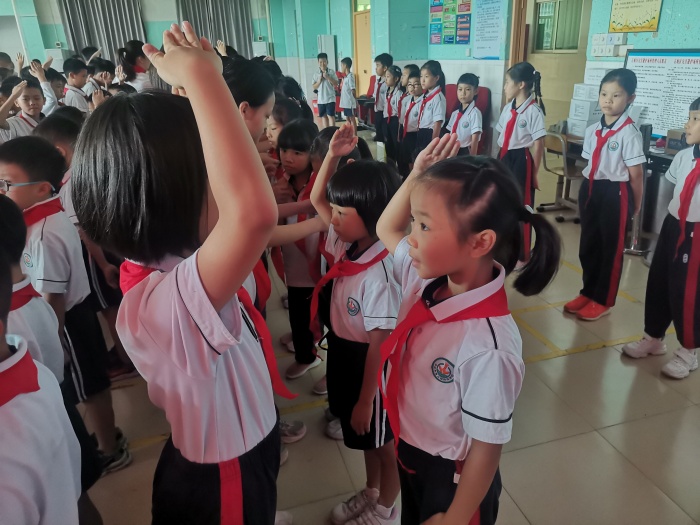 在主题队日中,各中队以主题队课的形式举行“请党放心,强国有我——喜迎少先队中山市第八次代表大会”少先队微仪式中队活动。各中队集中学习共和国成立72周年发展伟大光辉的发展历程,组织全体少先队员面向党旗、团旗、队旗重温“四个一”活动:敬一个队礼、唱一次队歌,激昂的队歌,响彻校园,唱响了队员对少先队组织的热爱、对伟大祖国的热爱!重温一次誓词、庄严呼号一次,让每一个队员人都热血沸腾,激发了少先队员的爱国意识!