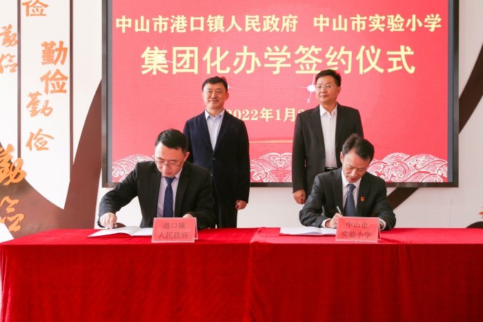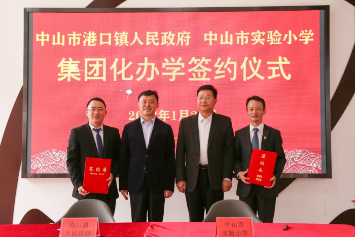 1月29日,中山市实验小学与港口镇政府合作办学签约仪式暨成员学校揭牌仪式暨“中山市实验小学教育集团大丰小学”揭牌仪式在大丰小学隆重举行。市教体局副局长黎国喜,港口镇党委书记黄金辉,港口镇副镇长易昊宏,市实验小学党总支书记、校长徐铭侃以及港口镇相关部门、社区、各中小学校长,市实验小学部分行政、大丰小学部分师生及家长代表等代表出席了签约仪式。