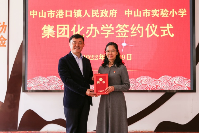 徐铭侃校长和易昊宏副镇长分别代表市实验小学和港口镇政府在合作协议上签字。活动中,黄金辉书记向中山市实验小学教育集团大丰小学校长黄艳冰同志颁发了聘书。最后,部分领导嘉宾为大丰小学揭牌。中山市实验小学教育集团正式成立!
