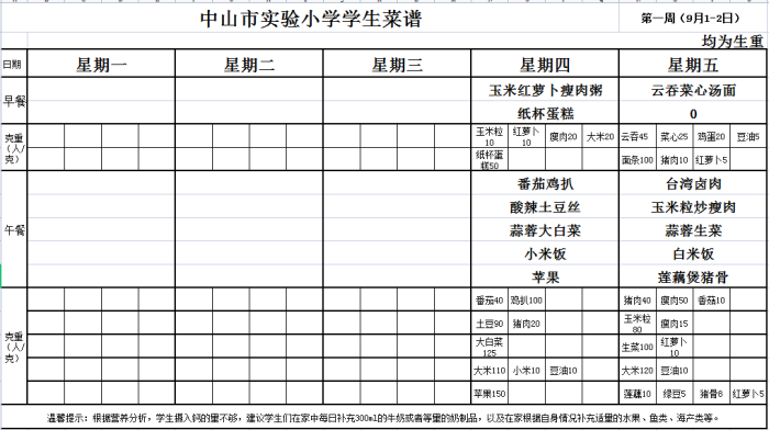 中山市实验小学第1周学生食谱
