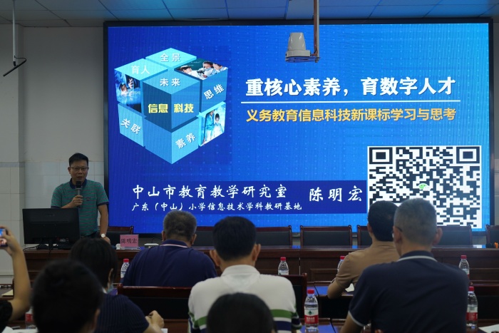 教育部“国培计划”专家库成员、广东省特级教师、中山市教育教学研究室信息技术教研员、广东省小学信息技术(中山)教研基地负责人陈明宏老师以头脑风暴的形式开展《重核心素养·育数字人才——义务教育信息科技新课标学习与思考》专题讲座,他围绕“课标核心要点、课程内容体系、教学实施建议、中山实践思考”这四个方面深度解读,并结合鲜活的案例进行分析,引导大家对新课标的学习与应用展开思考。