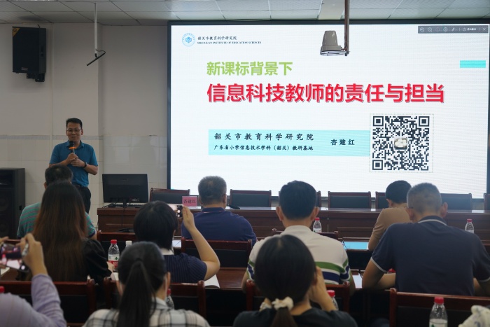 9月21日下午,韶关市教育科学研究院办公室副主任、信息技术学科教研员、省级学科教研基地负责人杏建红主任以《新课标背景下信息科技教师的责任与担当》为主题开展专题讲座,杏主任围绕“时代赋予信息科技教师的使命与担当、信息科技新课标带来的新变化与新挑战、新课标背景下信息科技的责任与担当”与在座教师进行交流。