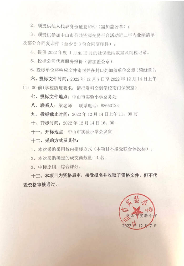 中山市实验小学聘请拍卖公司代理服务招标公告