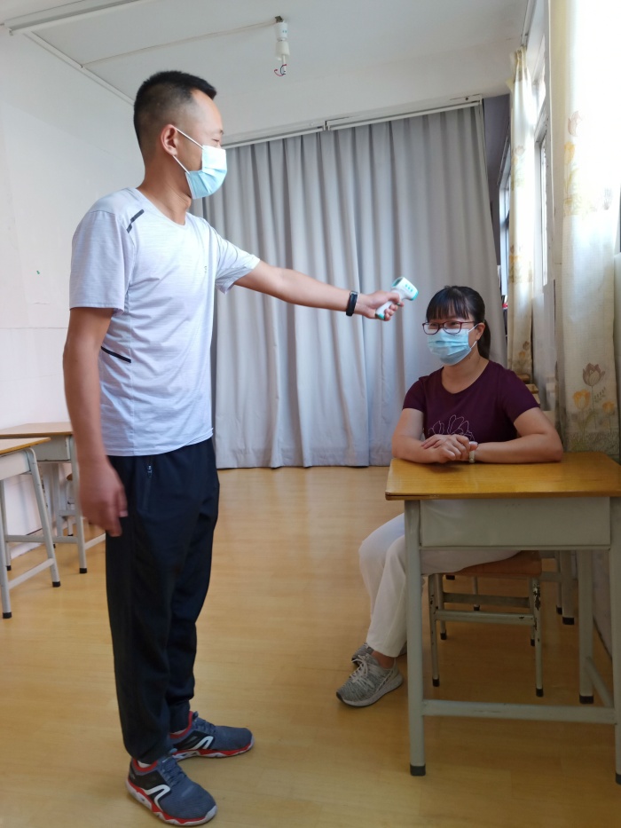 接着,学校进行“校园出现阳性密切接触者事件”安全演练,卫生副校长彭明震出席了本次演练。全体教职工扮演“学生”,当校园广播说出现阳性密切接触者的电话后,按预定方案进行测温、隔离、上报……演练结束,彭明震卫生副校长对演练过程进行了肯定。