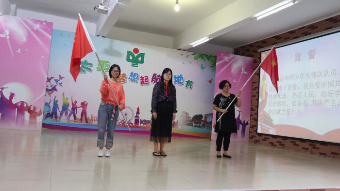 接着是新队员入队仪式。六年级的哥哥姐姐们给新队员授予少先队标志,帮助新队员戴上鲜艳的红领巾。大队辅导员余凤华老师带领新队员宣誓。每个新队员都庄严宣誓,眼中熠熠发光,满怀对少年先锋队的向往与期待。