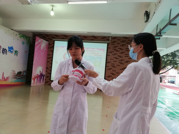 活动现场,陈医生带领同学们认识了牙齿的外形,结构,形态及功能,讲述了典型的牙齿问题——龋齿,细致地讲解了龋齿发生的主要原因及发展过程,随后,现场演示了正确的刷牙方法,并给同学们提出建议:希望大家可以坚持做到饭后漱口,早晚刷牙,定期检查,保护好自己的牙齿。