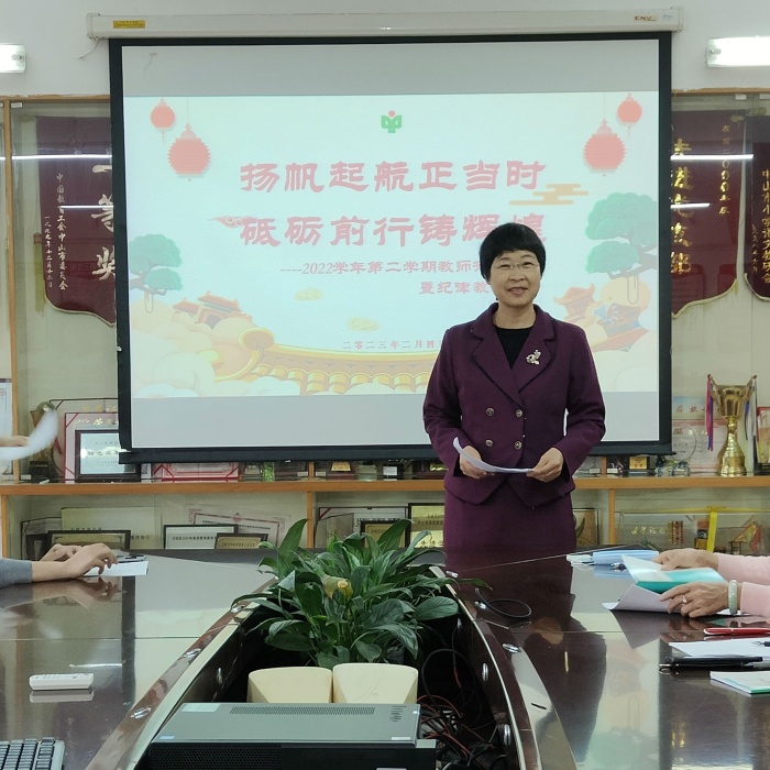 会议在刘晓君校长的祝福声中拉开帷幕!刘校长以“扬帆启航正当时 砥砺前行铸辉煌”为主题,总结了上学期的各项工作,回顾了上一学期,在市教育体育局和石岐街道党工委的关心下,在学校领导的不懈努力下,该校一体机覆盖了全校15个班级,并且每个课室都安装了新空调。改善了办学条件,优化了育人环境。这使学校的教学硬件设施建设实现了一次飞跃。同时,她总结了一学期以来学校取得的成绩,对老师们凝心聚力搞教育、师生积极参加各项比赛并获得优异成绩、老师们积极参加教研及课题研究表示充分的肯定。