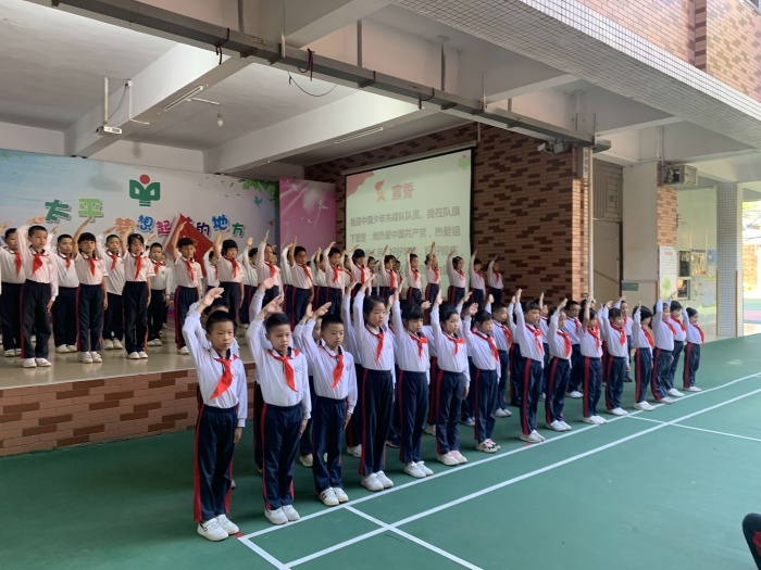 激动人心的时刻到了,大队长根据中国少年先锋队队员入队的要求,宣布批准新队员名单。六年级的哥哥姐姐们给新队员授予少先队标志,帮助新队员戴上鲜艳的红领巾。大队辅导员余凤华老师带领新队员宣誓。每个新队员都庄严宣誓,眼中熠熠发光,满怀对少年先锋队的向往与期待。