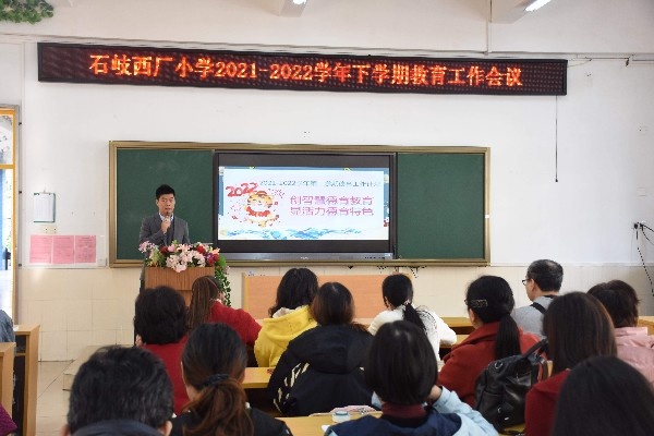 回首、沉淀,是为了更好地蓄力;总结、提升,是为了更好地前行。之后,杨翠萍校长对上学期学校的各项工作做了全面总结。她说,2021年,是西厂小学砥砺奋进的一年,是全体师生共同进步的一年,在习近平新时代中国特色社会主义思想的指引下,在上级领导的关心下,在家长朋友的配合下,全校教师用如磐的初心、奋斗的姿态,书写着教育者的使命担当,凝心聚力,拼搏进取,推动学校各项工作取得新成就,各项事业发展行稳致远。她高度赞扬了全体教师敬业爱生、甘于奉献的精神。杨校长对学校新学期的教育工作也提出了新要求:安全第一,切实做好疫情防控工作;守正创新,切实增强德育工作实效;常思五“问”,切实提升课堂教学质量;做实细节,切实推进“双减”工作落实等。杨校长以习近平总书记的话语“一个人遇到好老师是人生的幸运,一个学校拥有好老师是学校的光荣,一个民族源源不断涌现出一批又一批好老师则是民族的希望。”寄语全体教师,希望老师们争做有理想信念、有道德情操、有扎实学识、有仁爱之心的好老师,在新学期脚踏实地、勤奋工作,携手书写西厂小学发展的新篇章!