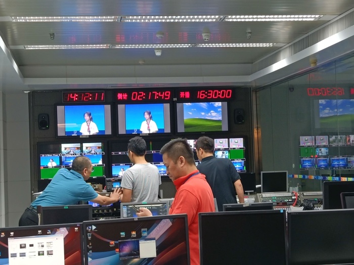 离开转播车,第二站是参观中山广播电视台的录播间。同学们平时经常在家收看中山新闻,没想到今日可以踏入新闻直播现场,站在主持人的位置去看到环形录播间的全貌,又好奇又兴奋。通过刘主任、李主任的讲解,同学们不仅知道了新闻直播与主持的节目流程,还了解到了播音主持工作风光背后的不易与艰辛。
