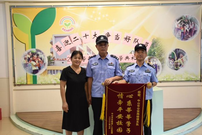 9月1日上午8:00,西厂校区的开学典礼正式开始!由副大队辅导员李老师主持,她带领同学们以热烈的掌声欢迎新老师们加入西厂小学这个充满生机活力的集体。紧接着,杨校长代表学校赠送锦旗给中山市经侦支队的警察叔叔们,衷心感谢英姿飒爽的他们,每天风雨不改在校门口站岗,守护同学们的安全。全体同学以整齐而响亮的声音向警察叔叔致谢:谢谢你们!你们辛苦了!