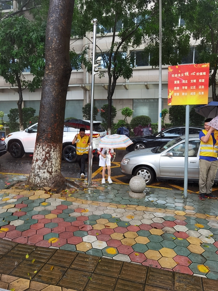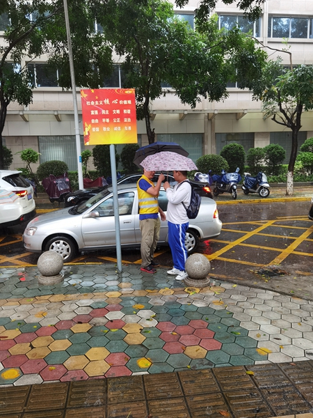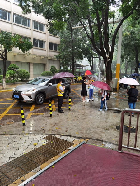 6月8日早晨,中山市气象台发布暴雨橙色预警。大大的雨点砸下来,发出噼里啪啦的响声,似乎有意考验上学的学子。今天刚好轮到五(3)班值岗,6位家长无惧风雨,撑着雨伞,身穿黄马甲,始终坚守在岗位上,有序地指挥学生过路,指挥家长停车,迎接学生们安全顺利地进入校园。