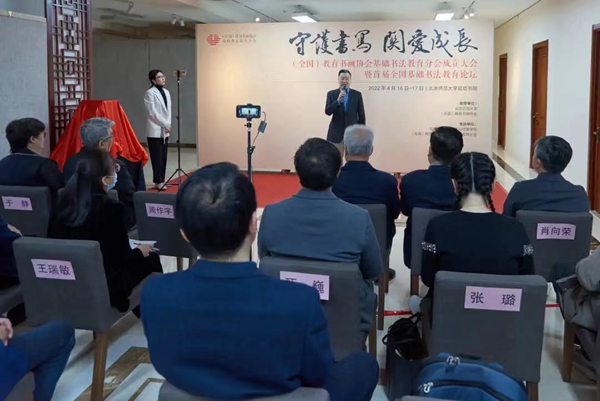 撰稿:公春江 审稿:唐鸿雁 二审:黄建喜 三审:周锦连 发布:区泳秋 近日,“守护书写,关爱成长”(全国)教育书画协会基础书法教育分会成立仪式暨首届全国基础书法教育论坛在北京师范大学启功书院隆重举行。基础书法教育分会是(全国)教育书画协会(教育部直属)批准的全国性文化团体,隶属于(全国)教育书画协会。因受疫情影响,开幕式采取线上方式同步直播。教育部、北京师范大学、中国书协、中国教育学会等单位领导出席成立仪式。来自全国基础书法教育一线的领导、专家、省市书法教研员、书法教师代表等500多人通过线上线下结合的方式参加了开幕式暨书法教育论坛。