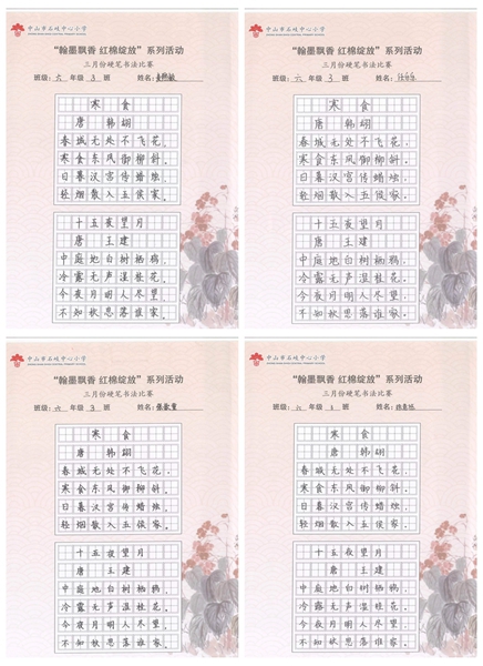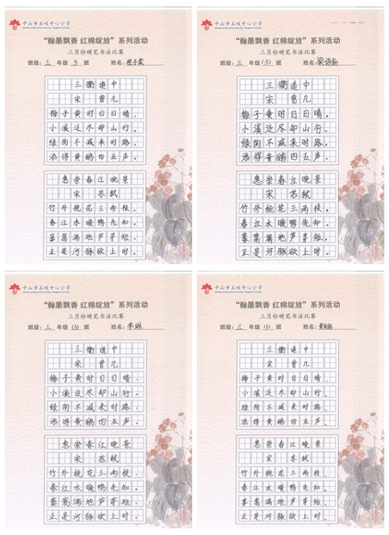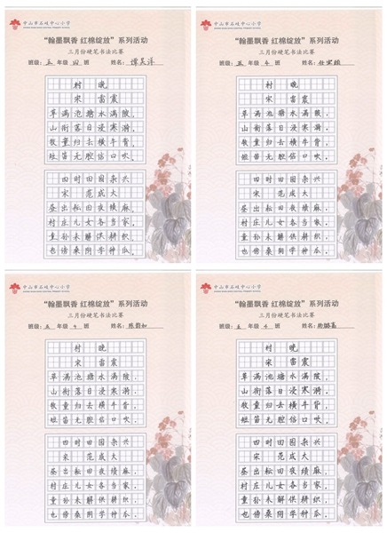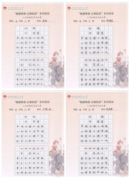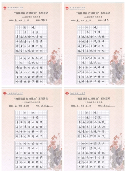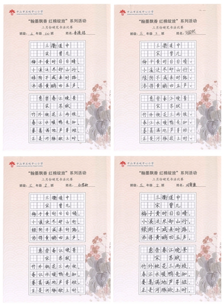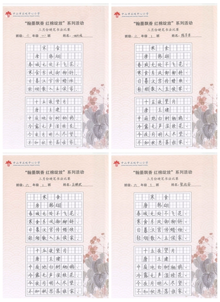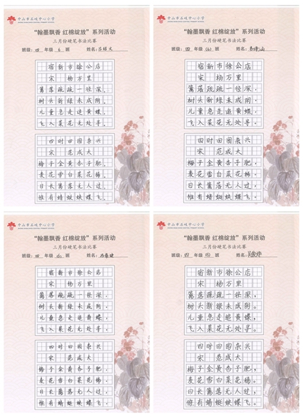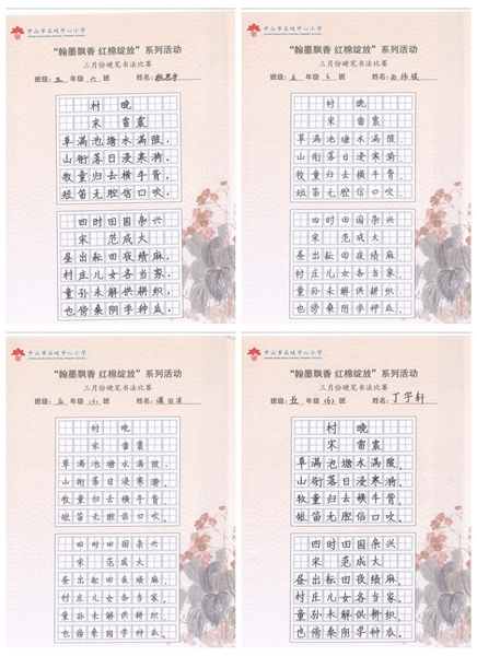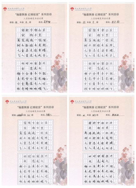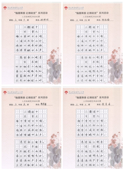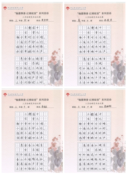 撰稿:公春江 审稿:王文儒 二审:黄建喜 三审:周锦连 发布:区泳秋 ——中山市石岐中心小学全校硬笔书法双月展获奖作品系列