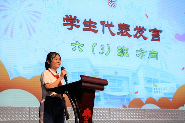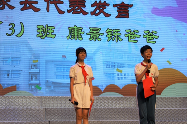 六(3)班康景铄同学的爸爸代表家长发言。他感谢学校的领导和教师,秉承因材施教的教育理念,全心打造适合学生的教育,为孩子们营造了一个温馨安全的港湾,让孩子彰显与生俱来的天赋,引领孩子从混沌走向清明,从稚嫩走向成熟。同时,他也代表家长对所有的孩子提出期待,希望孩子们能保持三心:一是善良的心;二是进取的心;三是勇敢的心。