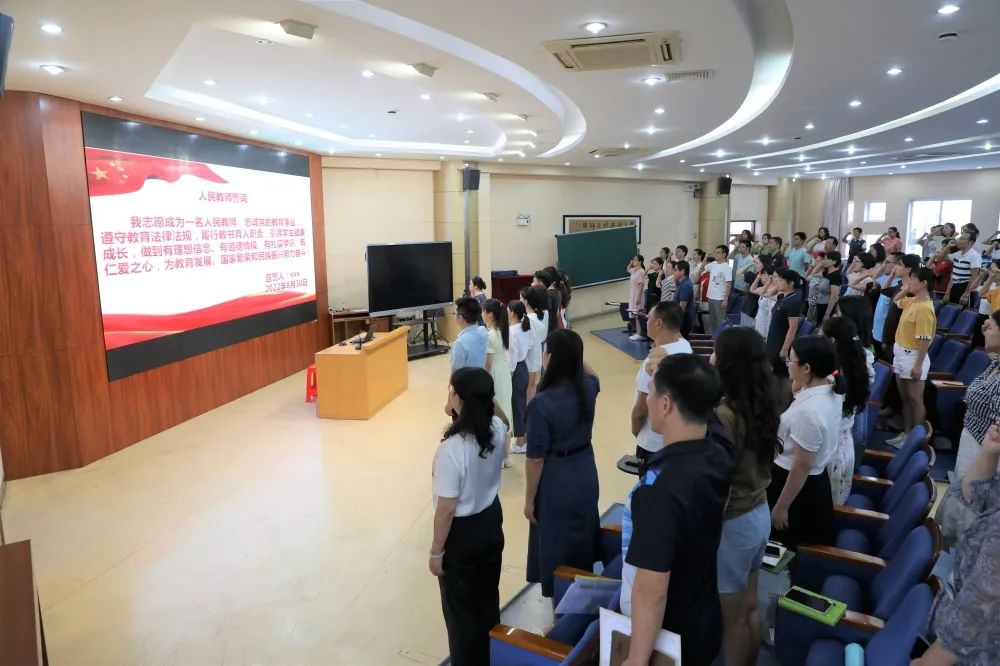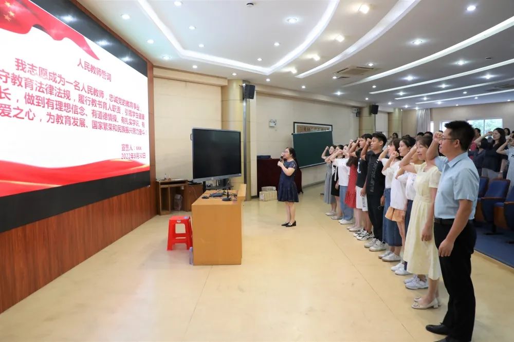 最后,梁书记带领2022年新入职教师和台下老教师共同重温了人民教师誓词,在庄重严肃的宣誓声中,全体教师再次感受到教师这份职业的神圣与立德树人的责任之重。