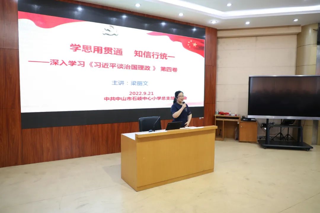 为进一步深化学习习近平新时代中国特色社会主义思想,增强学习宣传贯彻的思想自觉、政治自觉、行动自觉,不断从理论中汲取真理伟力、思想伟力、实践伟力,9月21日,中山市石岐中心小学以“学思用贯通 知信行统一”为主题,开展全校思想政治学习活动和9月主题党日活动,深入学习《习近平谈治国理政》第四卷。