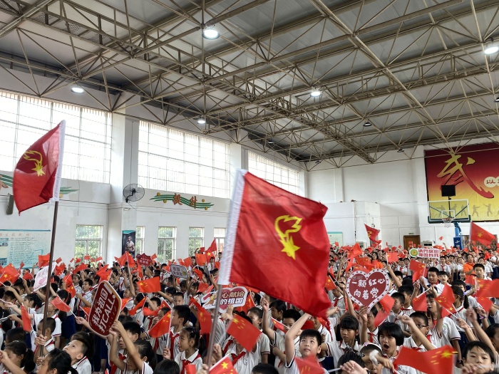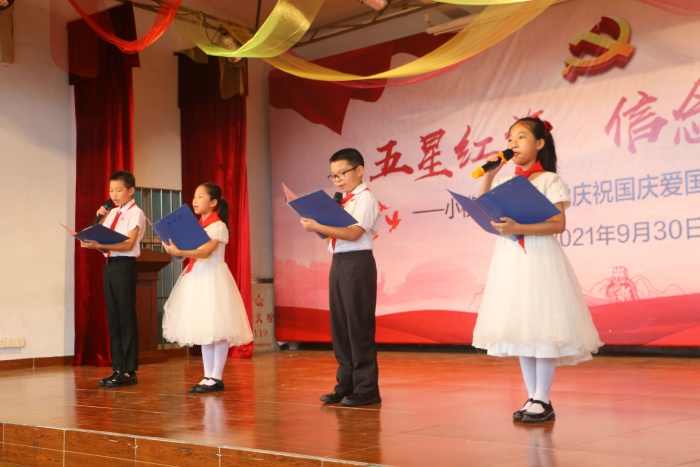 随后学生们在李晟赫老师的带领下,集体握拳高呼口号“伟大、光荣、正确的中国共产党万岁!”“伟大、光荣、英雄的中国人民万岁!”“伟大的中华人民共和国万岁!”会场的气氛进一步推向高潮,浓厚的爱国热情在老师们、学生们的心中激荡,化为了全校师生大合唱《歌唱祖国》的歌声。伴着歌声,老师们、学生们纷纷举起自己手中的小国旗,一抹抹鲜艳的“中国红”在老师们、学生们的手中闪耀,整个会场成为了“中国红”的海洋。“望万山红遍,层林尽染;漫江碧透,百舸争流。”在不远的未来,将使这些年轻的声音向世界发出祖国的最强音,将使这些稚嫩的肩膀逐渐成长,共同撑起祖国的一片朗朗晴空。