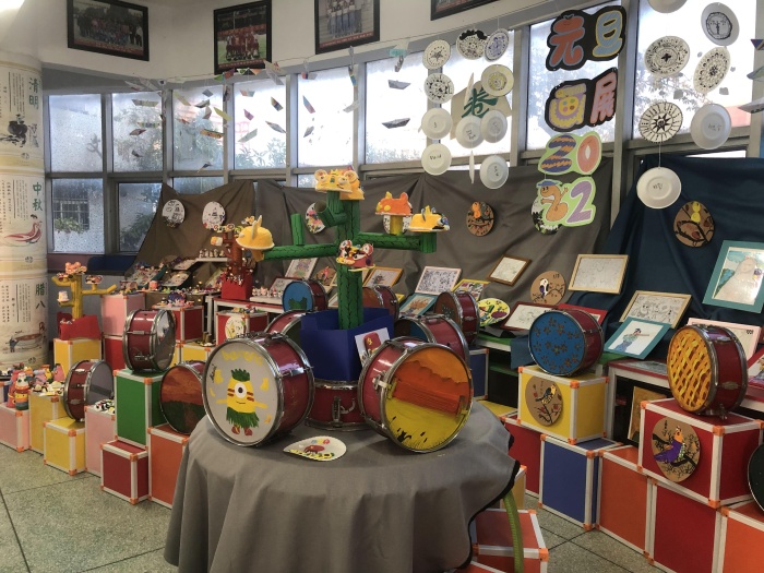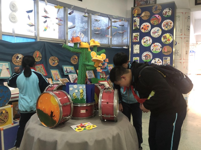 除此之外,安阜小学本次元旦画展的一大亮点是传达了环保的理念:学校美术兴趣小组的同学们在老师的带领下把鼓号队置换下来的旧小鼓变成了画布,创作了一系列鼓面装饰画。为画展增添了活泼的色彩。