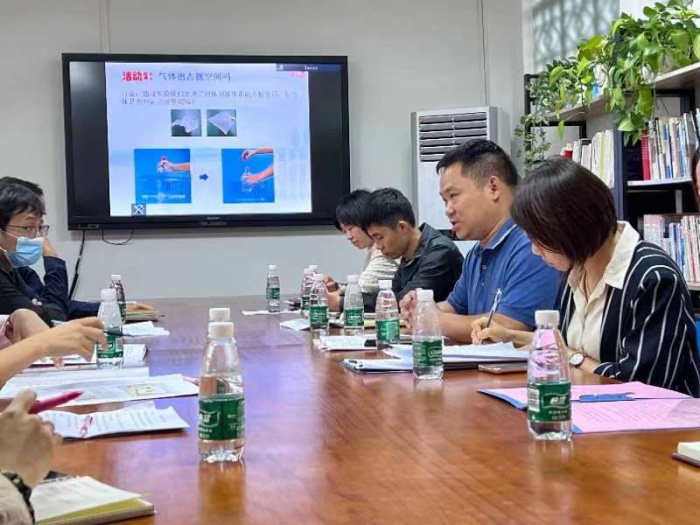 安阜小学的黄启成老师则对三年级上册《它们占据空间吗?》进行了课例展示。黄老师以小魔术“不会湿的纸”进行导入,吸引学生的兴趣。接着,通过讲“乌鸦喝水”的故事激发的学习兴趣,盘活思维,引导学生观察把小石头加入半瓶水中水位变化情况来证明固体和液体都能占据空间。在活动2的教学中,黄老师根据学生实际情况进行了改进,指导学生往塞住一端的U形管里面倒水,观察U形管内水位的变化,之后,拔掉胶塞,再次观察水位的变化。证明空气也能占据空间。