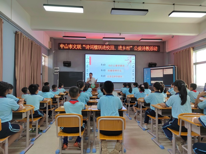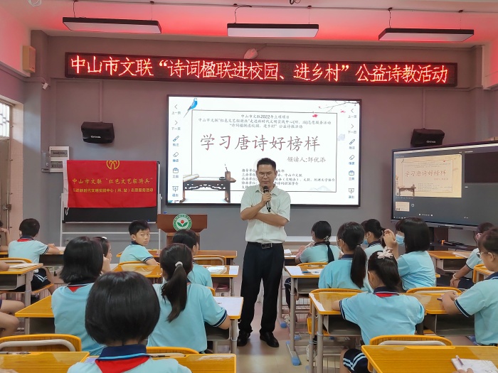 为了引导中小学生学习中华诗词,坚定文化自信,在传承和弘扬优秀传统文化的过程中做社会主义核心价值观的坚定信仰者、积极传播者、模范践行者。9月21日下午,坦洲镇合胜小学邀请了中山市诗人邹优添在学校多媒体教室开展了以学习唐诗好榜样为题的中华传统诗词知识讲座。此次活动由合胜小学教导处主任郭榆嫦主持。