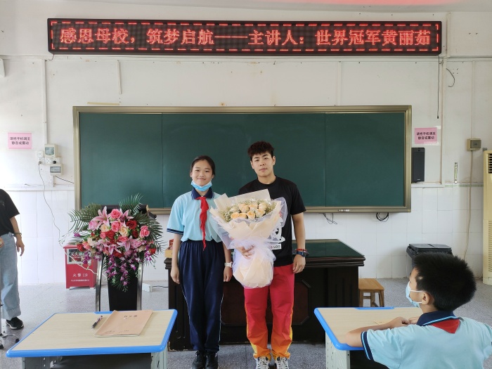 刚刚退役转入北京队的她利用此次休假回乡探亲的机会,回到母校给学弟学妹们作励志讲座。联一小学校长潘虹、德育主任甘群带、办公室主任肖素华以及大队辅导员贾晓鸽等陪同。