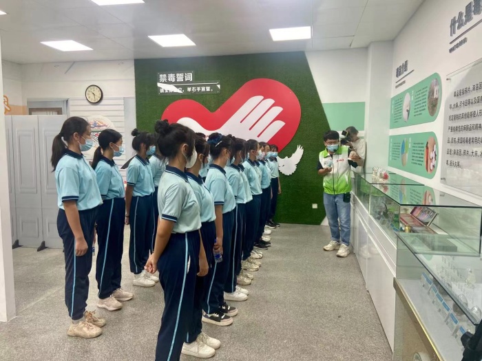 接着,同学们在禁毒办梁社工的带领下,来到模拟KTV、监狱实地等感受吸毒带来的巨大危害。随后,全体同学进行禁毒宣誓,坚决牢记历史使命,弘扬硝烟精神,自觉抵制毒品诱惑。最后,全体学生观看禁毒视频,直观、详实的内容介绍,让孩子们更加直观地了解毒品以及吸食毒品带来的危害性。