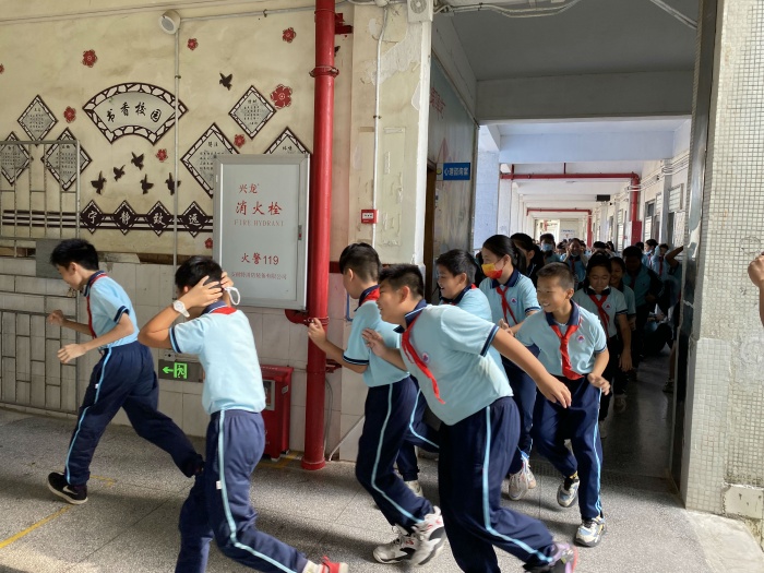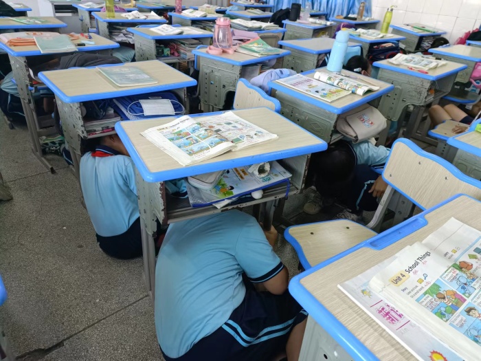 当警报响起后,全体教师立即停止手上工作,任课教师迅速赶往各楼梯口转弯处守护撤离学生,各班主任迅速赶到班级,一、二楼随堂科任教师组织学生有序撤离到操场上,三楼随堂科任教师组织学生就地避险,抱头、蜷曲、躲课桌下。50秒后,三楼随堂科任教师组织学生有序撤离课室,到达空旷操场上指定的地点集中。学生到达指定地点只用了1分32秒,无一人发生跌倒摔伤事故,达到预期效果。