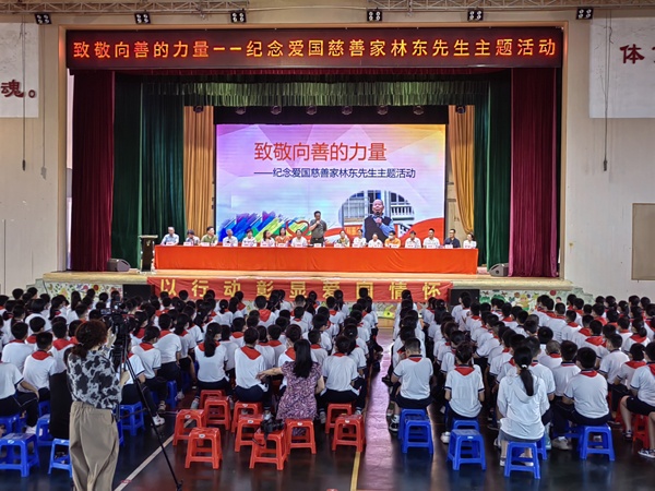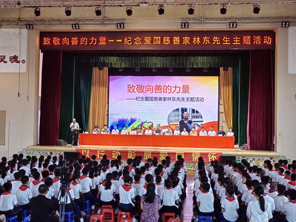 一直以来,林东先生言传身教,带动了很多人积极开展和参与公益慈善项目,有力地推动了我镇慈善事业的发展,被誉为“平民慈善家”。2022年6月6日上午,以“致敬向善的力量”为中心话题,在中山市坦洲镇林东小学展开了一场纪念爱国慈善家林东先生的主题活动,军事专家、林东先生子女以及全校师生参与了本次活动。