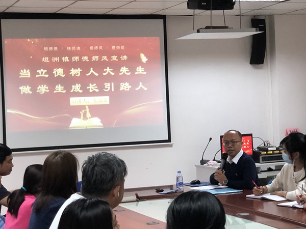 12月15日下午,我校有幸邀请到坦洲镇宣讲团成员、十四村小学麦满棠主任为我校教师作主题为“当立德树人大先生 做学生成长引路人”的专题讲座。本次讲座由王峰主任主持,全体教师聆听学习。